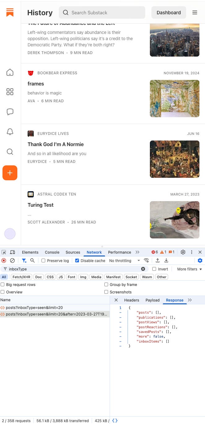 Since my least-recently viewed post was posted on March 27, 2023, the next history query uses that date (and time) as the value of after. However, I didn’t have a Substack account in 2023, so the query returns nothing and it looks like I have only read 20 posts in my life.